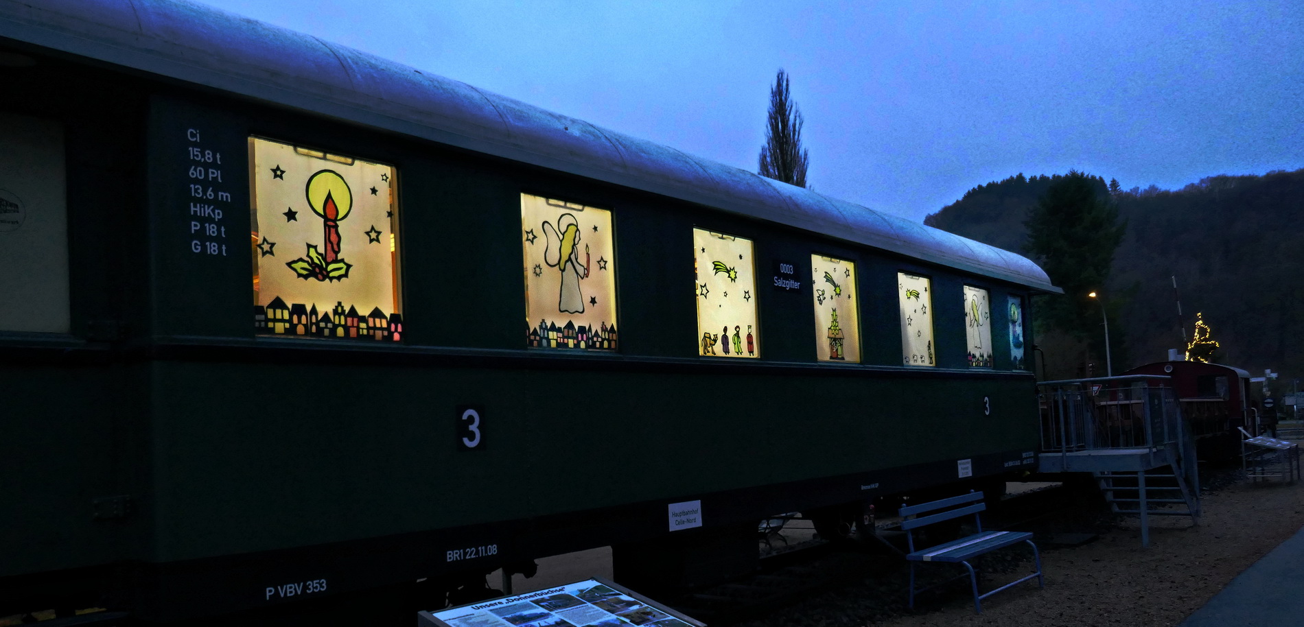 Auch in diesem Jahr steht der "Adventszug" - gestaltet von Monika Winkelmann und Tanja Bachels - wieder im Museumsbahnhof Pronsfeld zur Fahrt Richtung Weihnachten bereit. (Foto:W.R.)