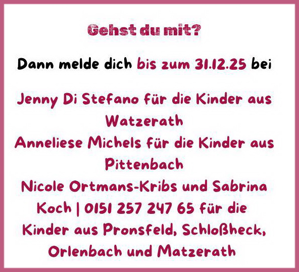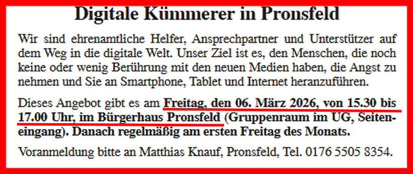 Hinweis in eigener Sache: Gerne werden Berichte über Veranstaltungen von Vereinen, Schule, KiTa und weiteren Gruppierungen auf unserer Homepage veröffentlicht. Bitte senden Sie Fotos und Texte an webmaster@pronsfeld-eifel.de