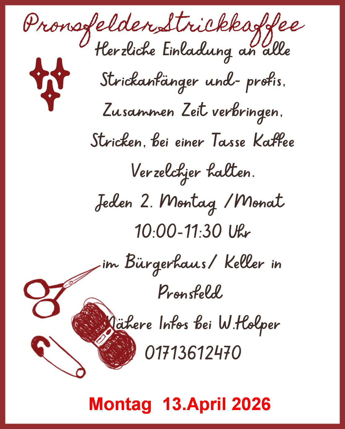 Auf Wunsch der bisherigen Teilnehmer findet das Strickkaffee ganzjährig statt. Jeder ist herzlich willkommen. Es können auch andere Handarbeiten verrichtet werden.