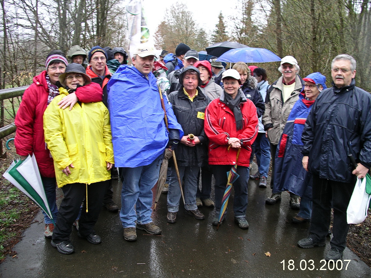 18.03.2007 Der Eifelverein Prüm durchquert -angeführt von Bgm. Söhngen im blauen Regendress - mit dem Wimpel des Deutschen Wandertages das Gemeindegebiet Pronsfeld. Die "Durchmarschgenehmigung" erteilte der Pronsfelder Ortsbgm. W. Richards (rechts)