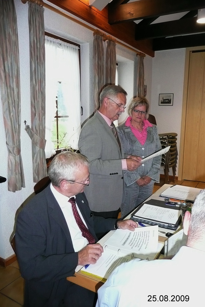25.08.2009 : Ortsbürgermeister Richards überreicht der neuen Ortsbürgermeisterin Monika Winkelmann in Anwesenheit von Verbandsbürgermeister Söhngen die Ernennungsurkunde
