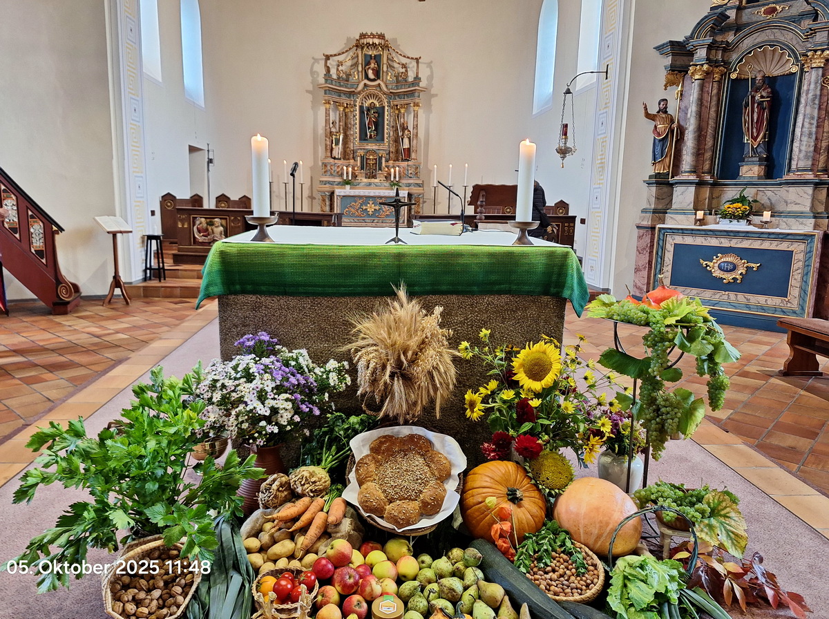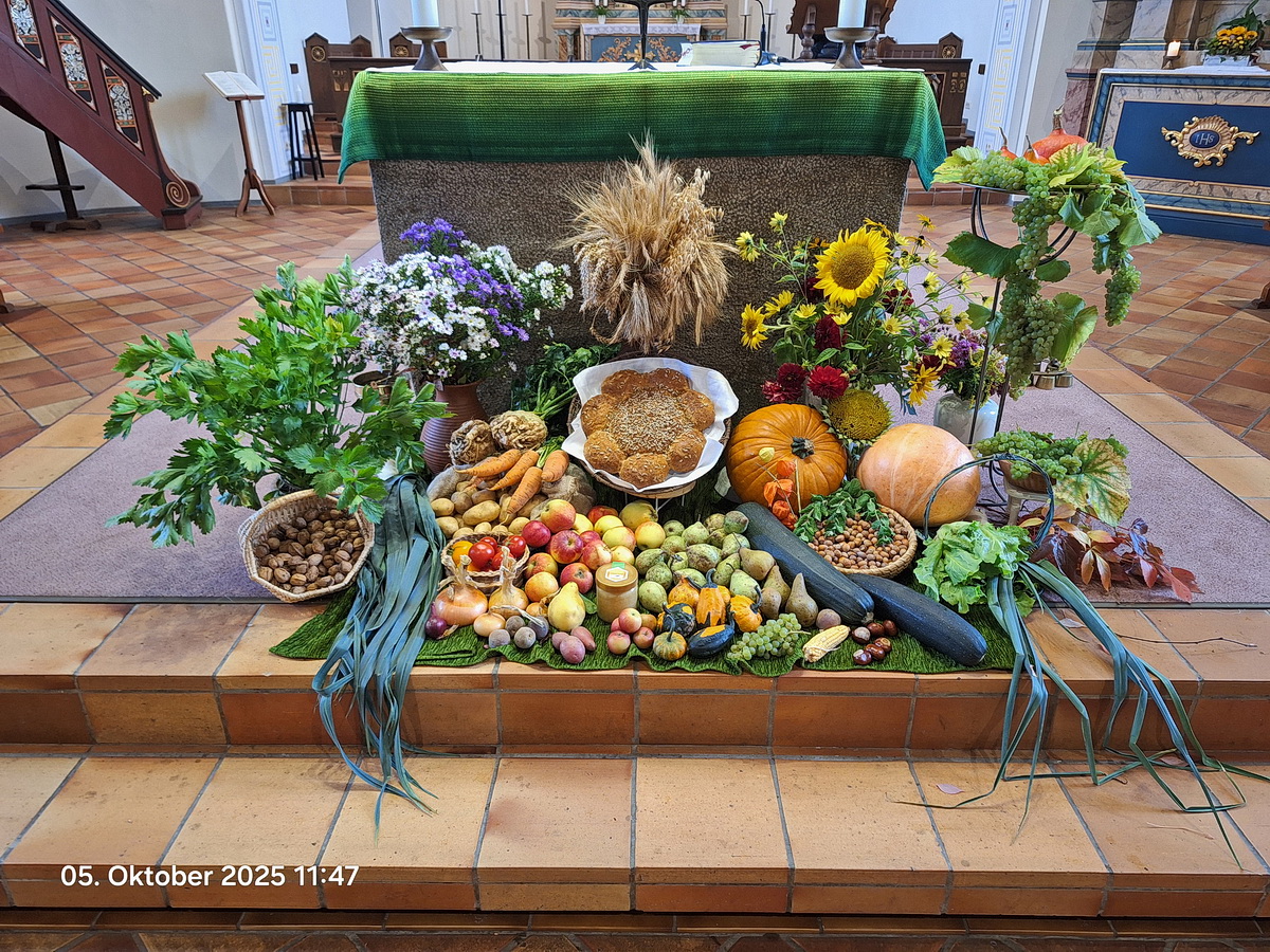 Anlässlich der kirchlichen Feier des Erntedankfestes hatten Mitglieder des Lokalen Teams "St. Remigius" auf den Altarstufen eine kunstvolle Dekoration aus Erntegaben gestaltet.