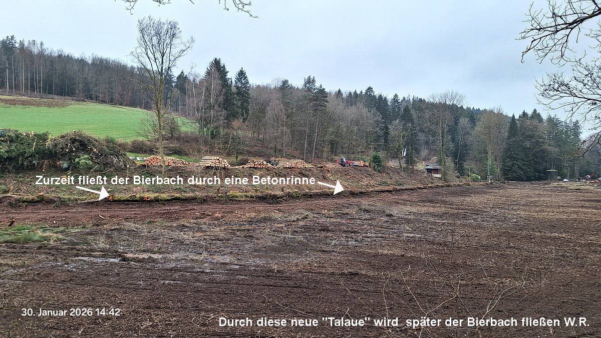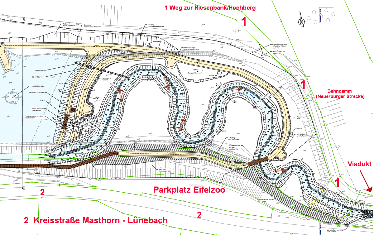 Nachdem 2023 der Mündungsbereich des Bierbaches in die Prüm bereits umgestaltet wurde, finden zurzeit große Baumaßnahmen oberhalb des Bierbachviaduktes im Bereich des Eifelzoos statt. Mit diesen Arbeiten wird die Verwirklichung der vorliegenden Planungen zum Hochwasserschutz am Bierbach, verbunden mit einer naturnahen Gewässerentwicklung fortgeführt. Seit etlichen Tagen werden umfangreiche Rodungsarbeiten durchgeführt. Außerdem wird das Gelände modelliert, das später der Bierbach mäanderförmig in einigen Schleifen durchfließen wird. (Siehe Planskizze im Bericht)