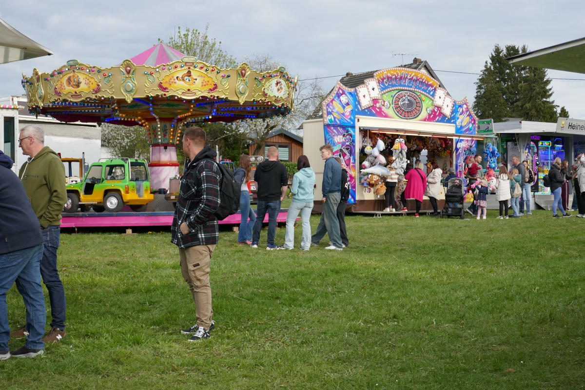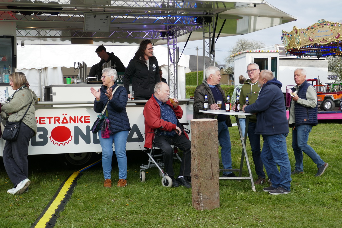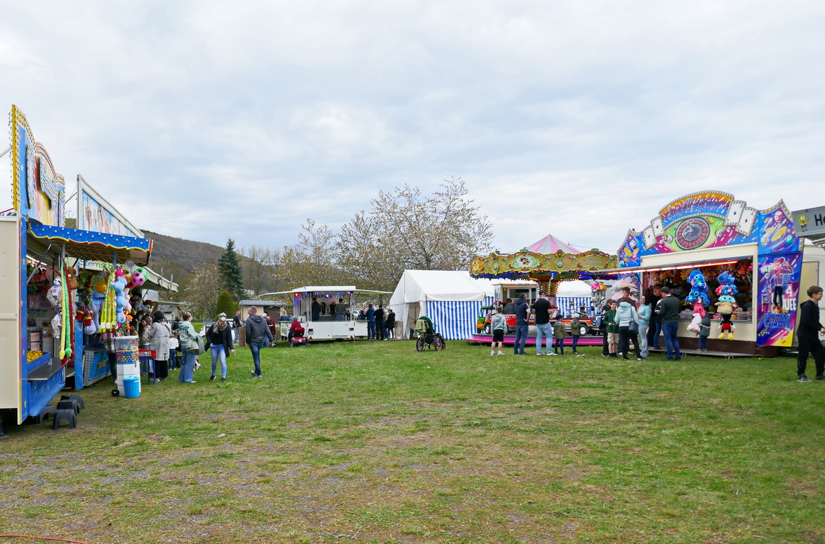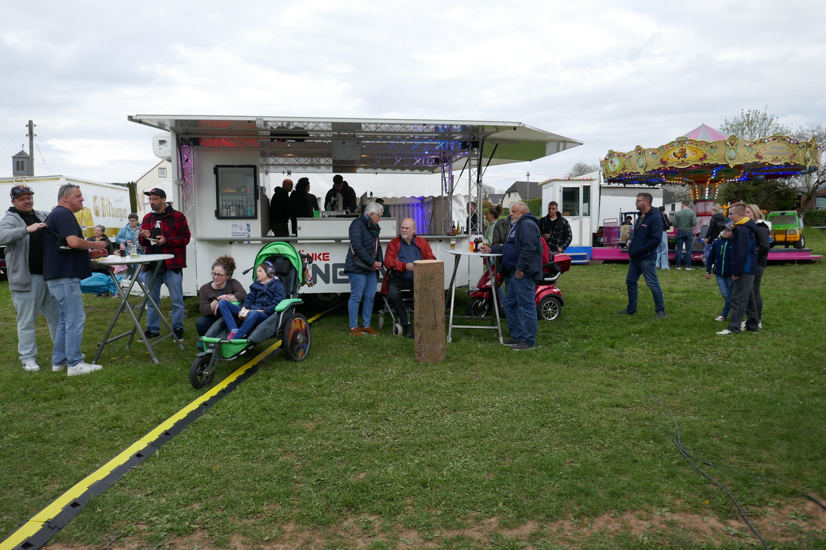 Mit dem Ritual des „Kirmesbaumaufrichtens“ auf dem Kirmesplatz wurde die Pronsfelder Kirmes, die am zweiten Sonntag nach Ostern gefeiert wird, offiziell am Kirmessamstag, dem 18.April, eröffnet. Und wie bereits seit vielen Jahren üblich, geschah dies unter musikalischer Mitwirkung des Musikvereins Pronsfeld auf dem Kirmesplatz in der Dorfmitte In diesem Jahr legte Ortsbürgermeister Harald Urfels sogar selbst Hand an und assistierte dem Gemeindearbeiter Bernd Kiedels bei seiner Arbeit. Etliche Gäste hatten sich eingefunden, um das Geschehen zu beobachten und den Darbietungen des Musikvereins zuzuhören. Natürlich wurden auch die ersten „Kirmesbierchen“ am Getränkepavillon, den der Sportverein während der Kirmesfeiertage betrieb, ausgeschenkt. Die Schaustellerfamilie Heinen hatte einige Kirmesgeschäfte aufgebaut , und auf einem schönen Karussell konnten die kleinen Gäste fröhlich ihre Runden drehen.