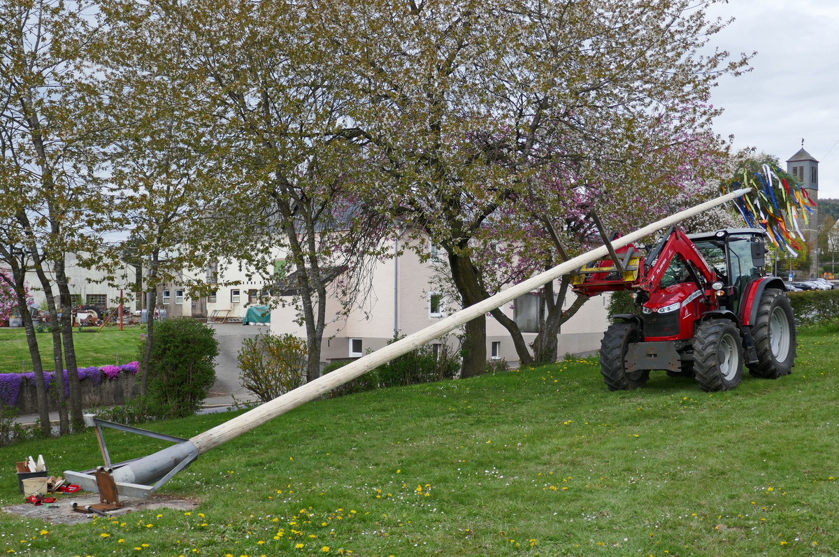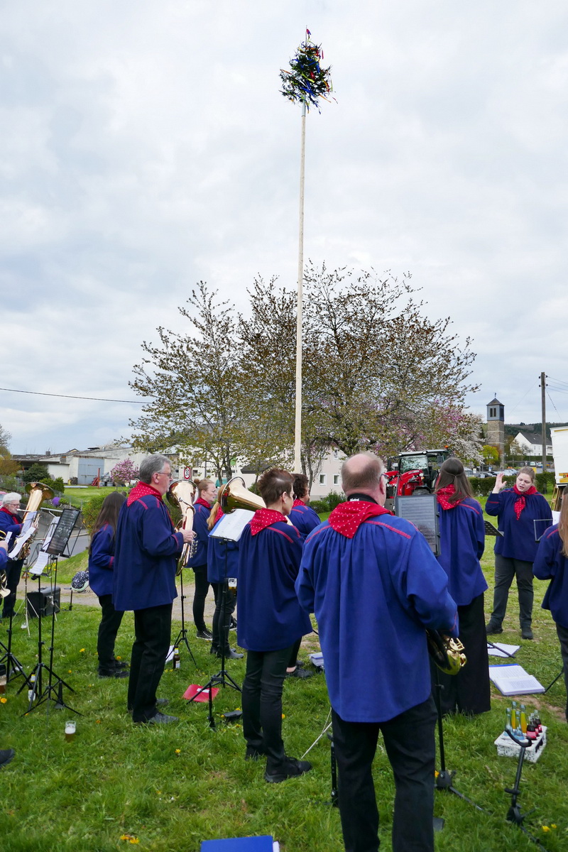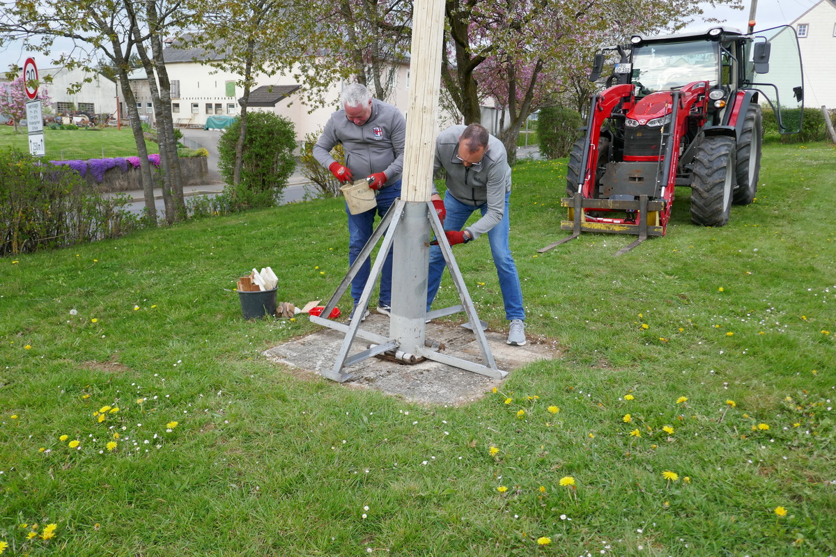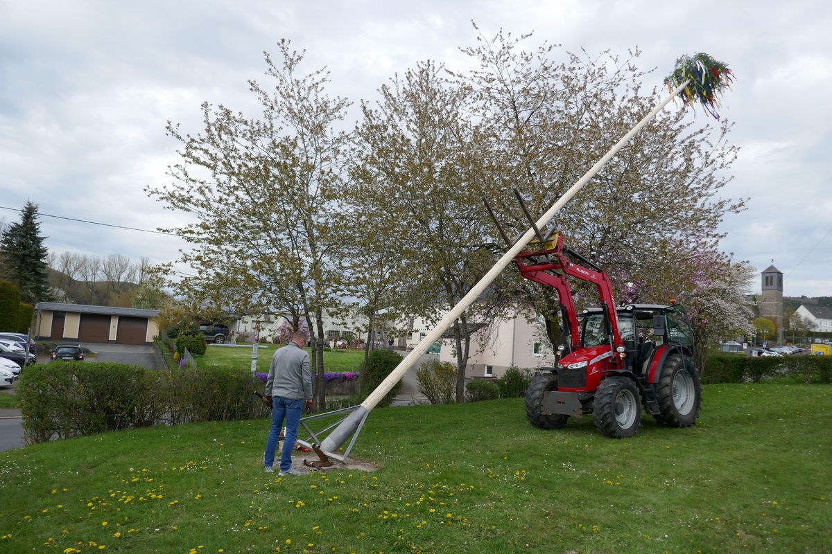 Mit dem Ritual des „Kirmesbaumaufrichtens“ auf dem Kirmesplatz wurde die Pronsfelder Kirmes, die am zweiten Sonntag nach Ostern gefeiert wird, offiziell am Kirmessamstag, dem 18.April, eröffnet. Und wie bereits seit vielen Jahren üblich, geschah dies unter musikalischer Mitwirkung des Musikvereins Pronsfeld auf dem Kirmesplatz in der Dorfmitte In diesem Jahr legte Ortsbürgermeister Harald Urfels sogar selbst Hand an und assistierte dem Gemeindearbeiter Bernd Kiedels bei seiner Arbeit. Etliche Gäste hatten sich eingefunden, um das Geschehen zu beobachten und den Darbietungen des Musikvereins zuzuhören. Natürlich wurden auch die ersten „Kirmesbierchen“ am Getränkepavillon, den der Sportverein während der Kirmesfeiertage betrieb, ausgeschenkt. Die Schaustellerfamilie Heinen hatte einige Kirmesgeschäfte aufgebaut , und auf einem schönen Karussell konnten die kleinen Gäste fröhlich ihre Runden drehen.