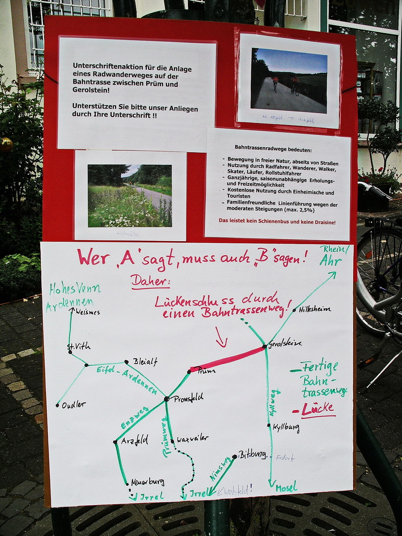 Fazit: Der langersehnte Wunsch nach einem Radweg zwischen Prüm und Gerolstein geht in Erfüllung. Dieser Radweg schließt eine Lücke im „Bahntrassenradwegenetz“ der Eifel und wird eine Erfolgsgeschichte werden. Auch für unsere Gemeinde Pronsfeld hat dieser "Lückenschluss" große touristische Bedeutung : aus dem ehemaligen Eisenbahnknotenpunkt ist dann ein bedeutender Knotenpunkt im Radwegenetz der Eifel geworden. Der Lückenschluss zwischen Prüm und Gerolstein wurde am Radfahrsonntag 2007 bereits in Pronsfeld gefordert. Hunderte Radfahrerinnen und Radfahrer bezeugten es damals bei einer Unterschriftenaktion in Pronsfeld.