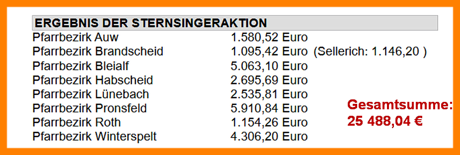 Das Ergebnis der Sternsingeraktion 2026 in der Pfarrei St. Marien Bleialf (Quelle: Pfarrbrief)