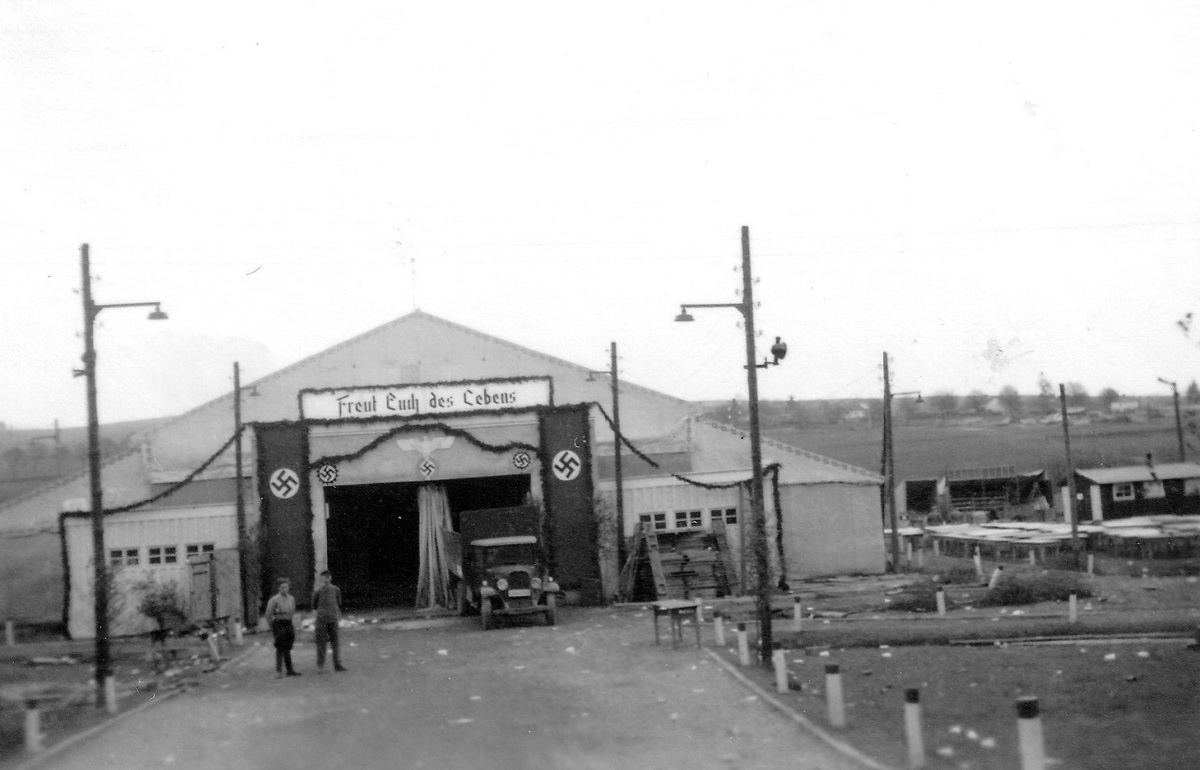 Dieses Foto von 1939 zeigt den Zugang zum "Gemeinschaftslager II" von der Lünebacherstraße her. Das Foto wurde aus dem früheren Haus Marnach aufgenommen.(Heute steht hier eine Verkaufshalle der Fa. Mais) Im Hintergrund ist der Höhenzug zu erkennen, auf dem die Kreisstraße von Lünebach nach Schloßheck/Prüm verläuft). Bei den Baracken gab es verschiedene Typen: Wohnbaracken, Küchenbaracken, Sanitärbaracken, Bürobaracken, Werkstätten)