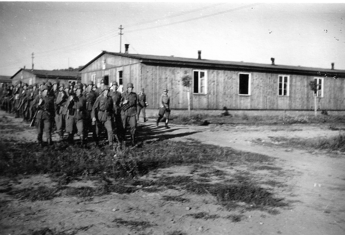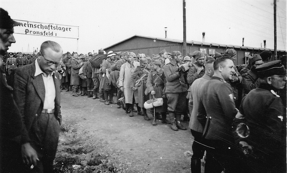 Schon Anfang Juni 1940 erhielt das Lager Pronsfeld eine neue Funktion. Es wurde zum Kriegsgefangenenlager. Das Foto zeigt die ersten französischen Kriegsgefangenen im Gemeinschaftslager Pronsfeld I . Ab Herbst 1941 kamen auch Kriegsgefangene aus der Sowjetunion in das Pronsfelder Lager.